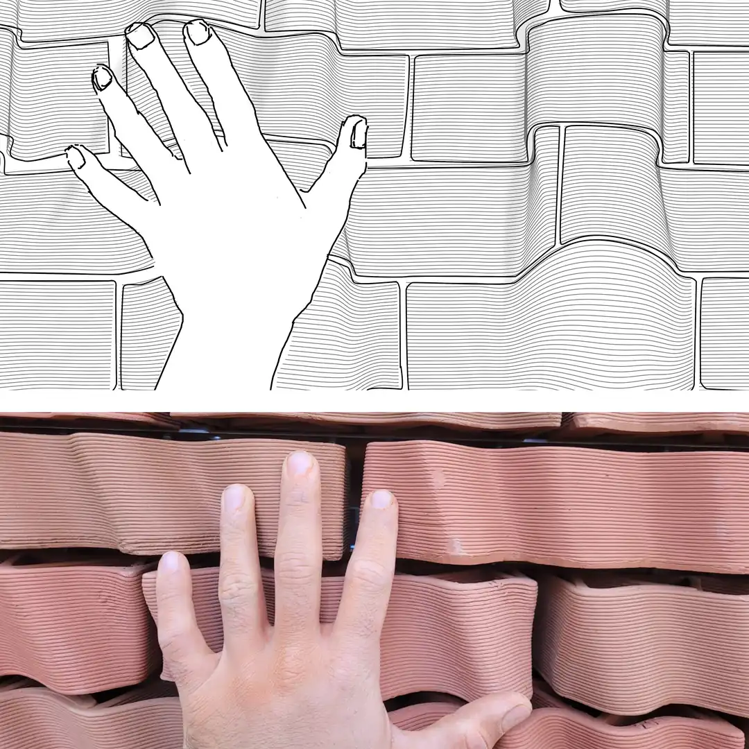 This work frees the brick from this rigid typology through 21st-century digital fabrication; its surface flows and folds like a curtain. Produced via ceramic 3D printing without molds, therefore, each brick is uniquely shaped to meet the needs of the design.